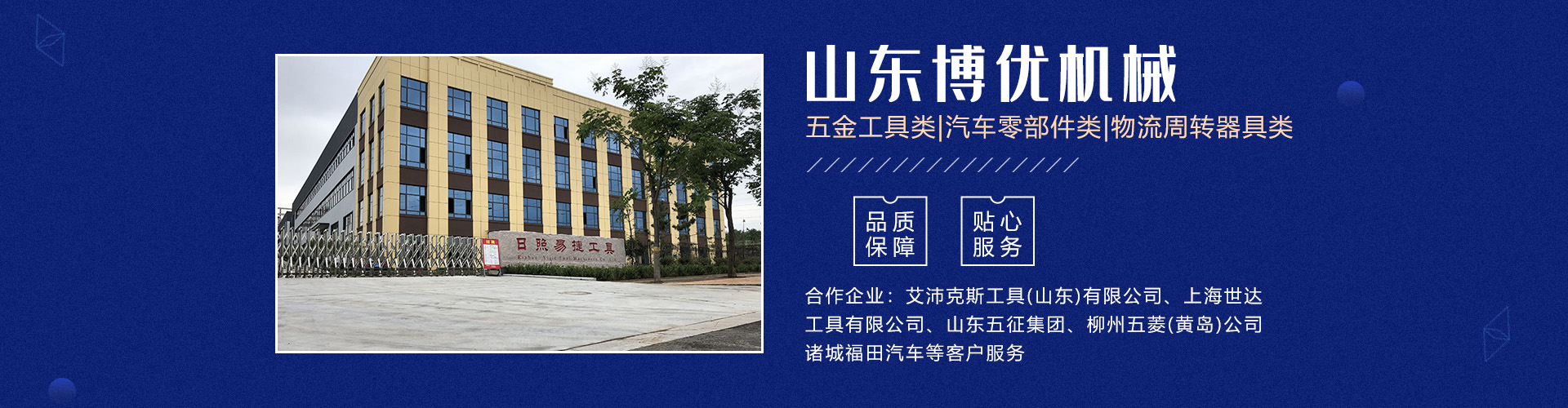 分公司日照易捷工具制造有限公司坐落在山東省日照市五蓮縣工業(yè)園,占地65畝(五蓮縣日照路與人民路交匯處),現(xiàn)有員工60名。公司主要產(chǎn)品有五金工具類及汽車零部件類、模具制作等三大系列。 主要設(shè)備有加工中心、數(shù)控車床生產(chǎn)線、磨床、研磨機(jī)、拋光機(jī)、冷鐓擠壓成型機(jī)、數(shù)控液壓模鍛錘等機(jī)械加工設(shè)備140余臺(tái)套。公司主要為艾沛克斯工具(山東)有限公司、上海世達(dá)工具有限公司、山東五征集團(tuán)、柳州五菱(黃島)公司、諸城福田汽車等客戶服務(wù)。公司多年被評(píng)為優(yōu)秀供應(yīng)商。